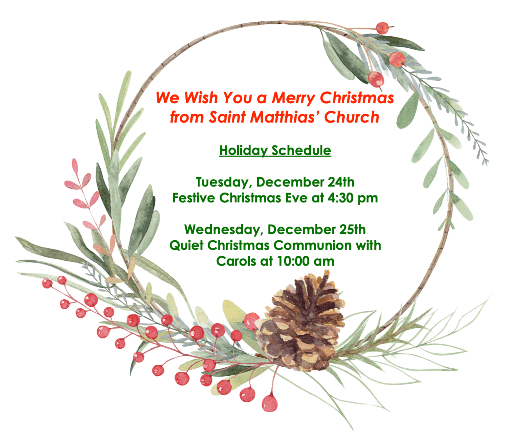 Holiday Schedule Posted on December 4, 2024 by Saint Matthias' Church Share this: Click to share on X (Opens in new window) X Click to share on Facebook (Opens in new window) Facebook Like Loading...