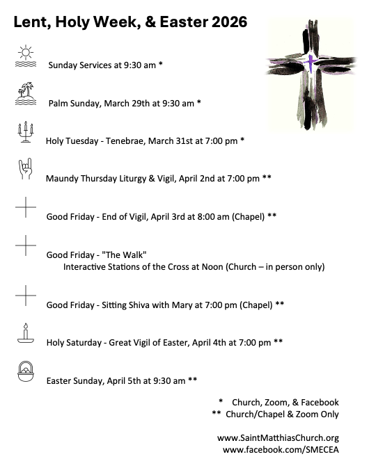 Lent, Holy Week & Easter 2026 Posted on March 4, 2026 by Saint Matthias' Church Share this: Share on X (Opens in new window) X Share on Facebook (Opens in new window) Facebook Like Loading...